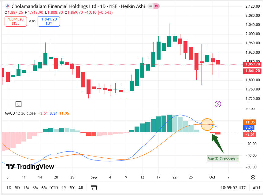 Cholamandalam Financial Holdings Limited is showing a bearish MACD crossover, where the MACD line falls below the signal line. This typically indicates weakening momentum and a potential price decline, signaling traders to be cautious or consider selling.