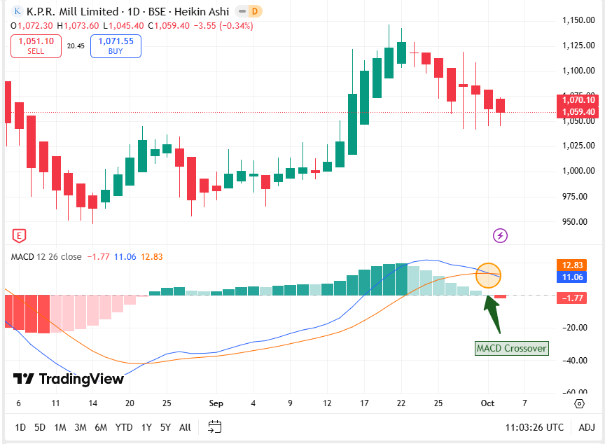 K P R Mill Ltd has formed a bearish MACD crossover, with the MACD line crossing under the signal line. This suggests weakening momentum and potential downward movement, signaling a possible selling opportunity for traders.