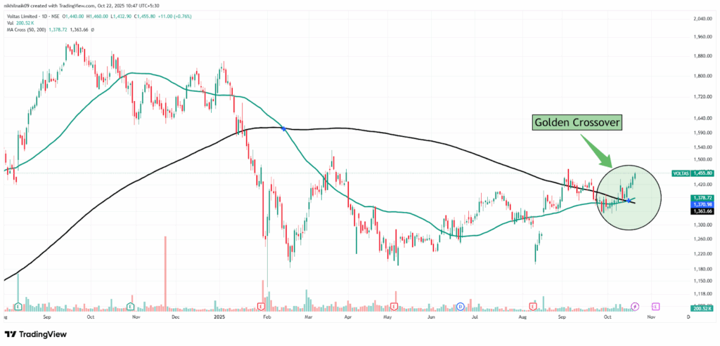 The golden crossover took place on October 16, 2025, at a price of Rs. 1,370.98 with decent volumes of 910.38 K shares. The stock closed at Rs. 1,455.80 in Tuesday’s session, reflecting a 0.76 percent increase in the intraday trade.