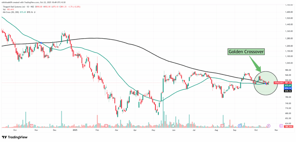 The golden crossover took place on October 16, 2025, at a price of Rs. 874.14 with decent volumes of 580.46 K shares. The stock closed at Rs. 881.35 in Tuesday’s session, reflecting a 0.20 percent decrease in the intraday trade.