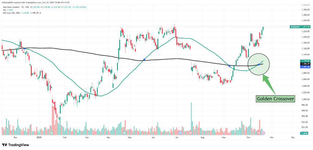 The golden crossover took place on October 15, 2025, at a price of Rs. 1,107.36 with decent volumes of 6.33 million shares. The stock closed at Rs. 1,237.30 in Tuesday’s session, reflecting a 0.92 percent increase in the intraday trade.