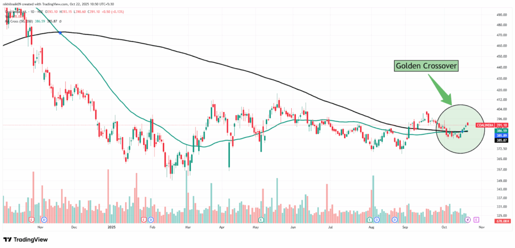The golden crossover took place on October 16, 2025, at a price of Rs. 385.89 with decent volumes of 3.51 million shares. The stock closed at Rs. 391.10 in Tuesday’s session, reflecting a 0.13 percent increase in the intraday trade.