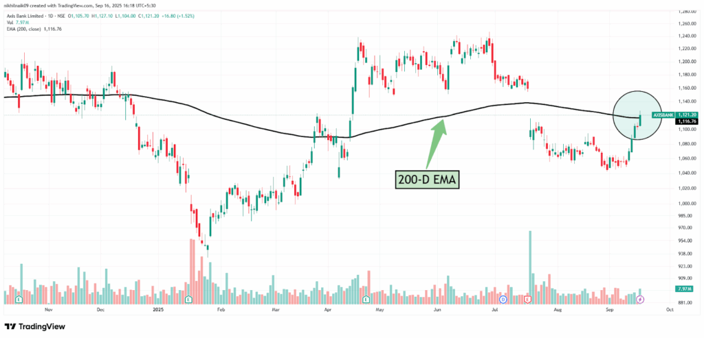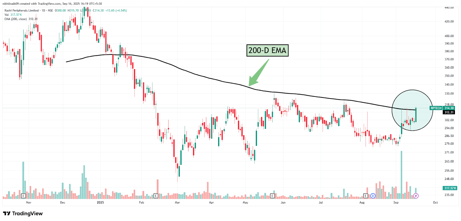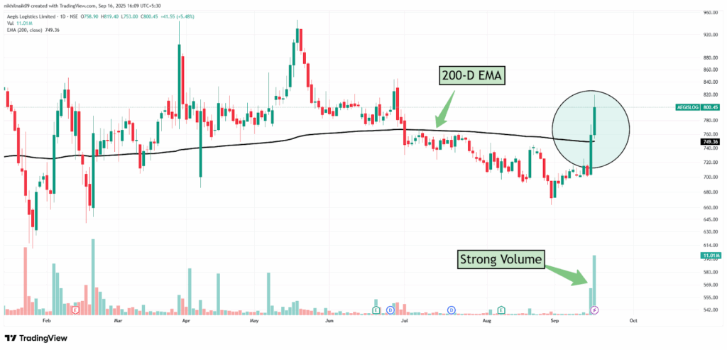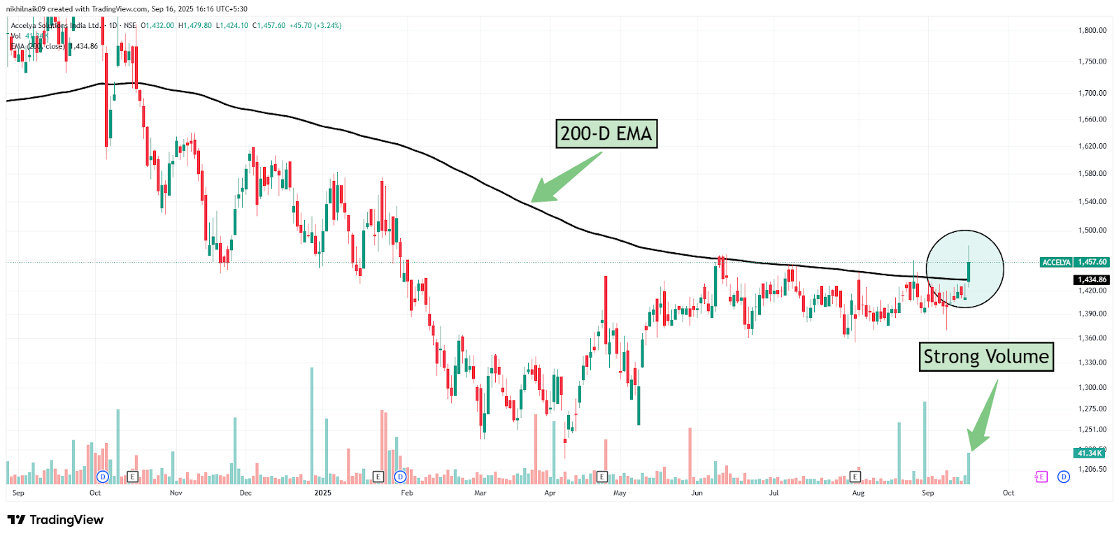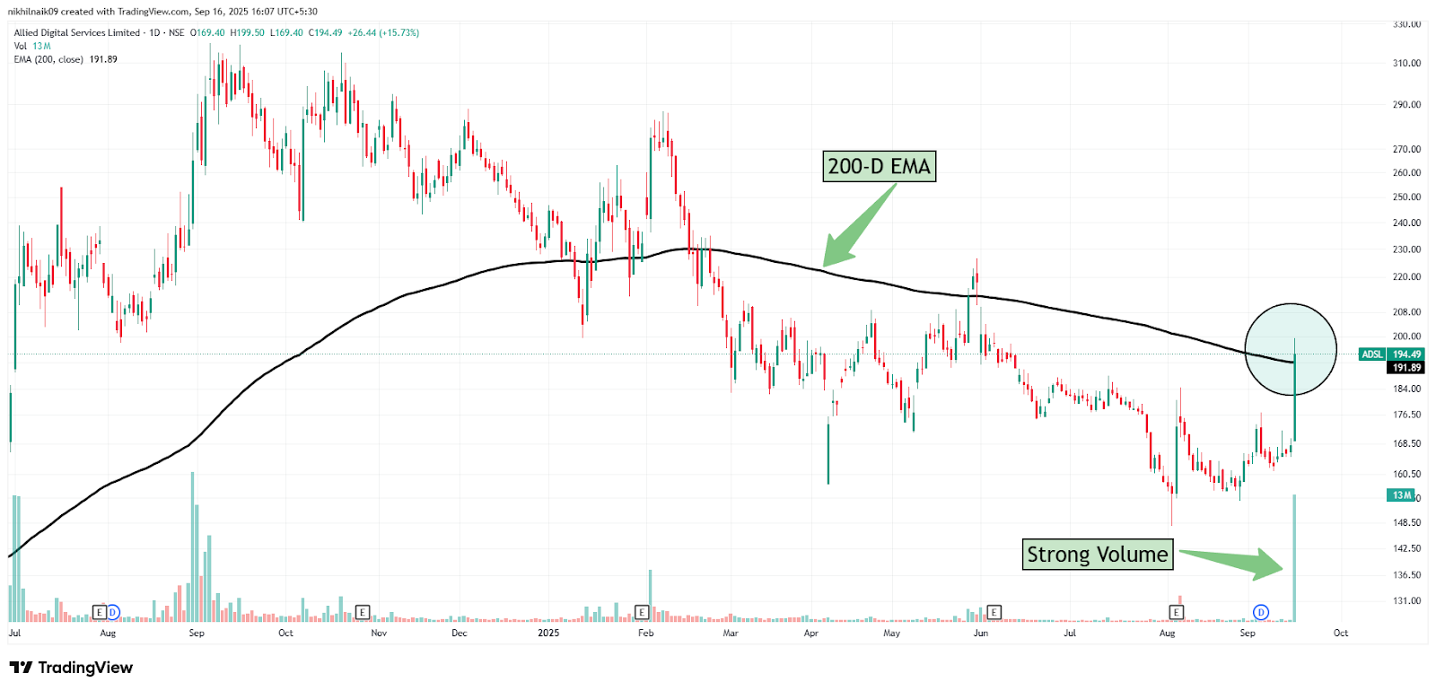 When a stock breaks above the 200-day EMA with strong trading volume, it is seen as a strong bullish sign. This shows growing investor confidence and increases the chance of further price gains. High volume also makes the breakout more reliable, helping traders and long-term investors find better entry points.