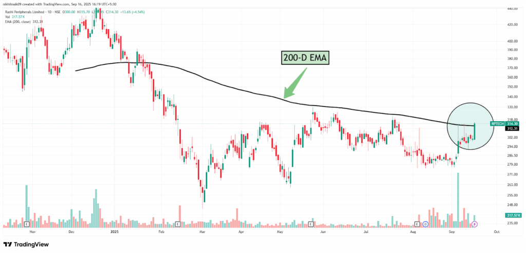 On September 16, 2025, the stock broke its 200-day exponential moving average at Rs. 312.31, with a strong trading volume of 317.57 K shares. The stock closed above its 200-day moving average at Rs. 314.30 in Tuesday’s session, reflecting up to a 4.54 percent increase in the intraday trade.