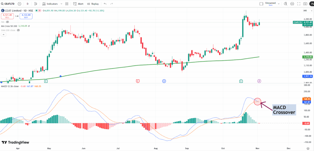 A bearish MACD crossover was seen in the CEAT as the MACD line crossed below the signal line, signaling potential downward momentum. This technical pattern is considered a sell signal and may indicate the start of a new downtrend, prompting traders to be cautious or consider exiting long positions.