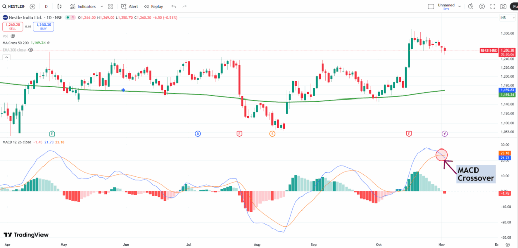 A bearish MACD crossover was seen in Nestlé India as the MACD line crossed below the signal line, signaling potential downward momentum. This technical pattern is considered a sell signal and may indicate the start of a new downtrend, prompting traders to be cautious or consider exiting long positions.