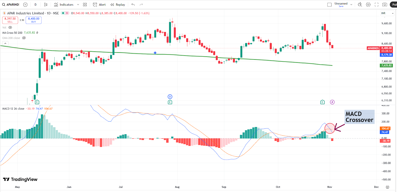 A bearish MACD crossover was seen in Apar Industries as the MACD line crossed below the signal line, signaling potential downward momentum. This technical pattern is considered a sell signal and may indicate the start of a new downtrend, prompting traders to be cautious or consider exiting long positions.