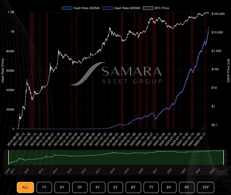 When the short-term hash rate recovers and crosses back above the long-term average, it signals that miners are coming back online, marking a return to network strength.