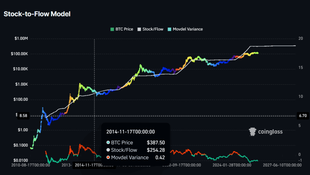 The Stock-to-Flow (S2F) Model is a scarcity-based valuation framework originally used for commodities like gold and silver. It measures the relationship between Bitcoin’s existing supply (stock) and its annual issuance (flow).