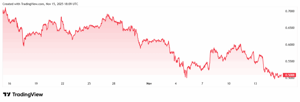 Cardano remains one of the most recognized blockchain projects, and its long-term reputation still attracts holders. ADA trades near $0.50 with a $28.4B market cap, placing it among the top cryptocurrencies by size. Even with this strong base, bullish momentum has slowed. The token continues to face pressure when it approaches the $0.60–$0.65 region, where sellers tend to appear.