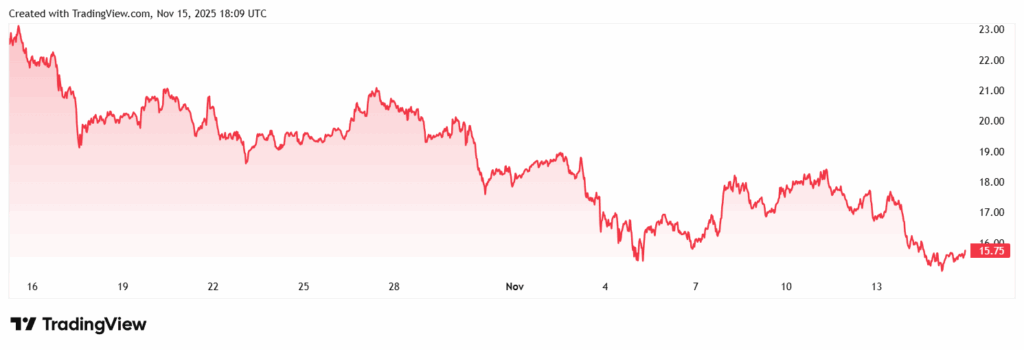Avalanche was one of the strongest performers in past cycles. It still holds a loyal community and a busy ecosystem. AVAX trades around $16.50 with a market cap above $12.9B, placing it comfortably within the top crypto rankings. Even so, it has struggled to move beyond key resistance around $20, where the trend often reverses.