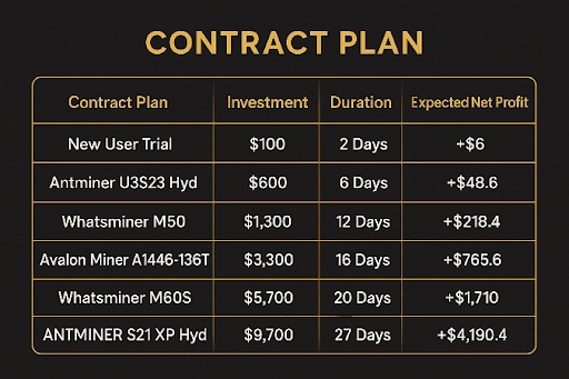 A wide selection of contracts and customizable income plans. Whether you’re a beginner or an experienced investor, Anchor Mining offers flexible contract options. From short-term, high-frequency investments to long-term, stable investments, a variety of plans meet your diverse strategic needs, allowing you to easily plan your profit trajectory.