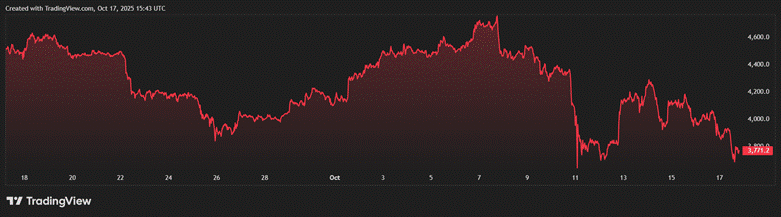 Over the past months, ETH has repeatedly hit resistance between $4,250 and $4,400, failing to break through decisively. On the downside, support is sitting near the high $3,000s, a zone that’s been tested several times this year.