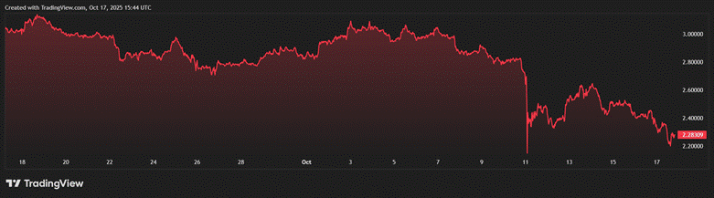 It faces significant resistance between $2.60 and $2.90, with overhead supply expected to increase further around the $3.00–$3.40 zone. Support has been holding around $2.30–$2.50, though analysts warn that a breakdown could see it retest the low $2s.