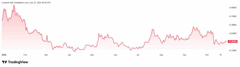Analysts identify major resistance near $0.21–$0.24 USD, with short-term support sitting around $0.17 USD. The token has struggled to push past these upper levels since early 2024, showing reduced momentum. Without new use cases or protocol upgrades, it’s becoming harder for Dogecoin to replicate its past explosive runs.