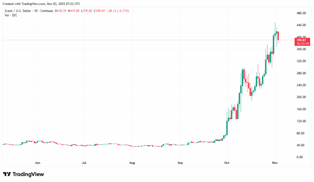 Zcash (ZEC) has surged more than 400% in the past month, reaching nearly $420 in late October 2025 and briefly surpassing Monero (XMR) in market cap. ECC’s Q4 2025 roadmap introduced privacy innovations like the Orchard protocol and P2SH multisig wallets, supported by Grayscale’s $85M ZEC fund. The shielded supply now exceeds 4.1M ZEC, covering 27.5% of total tokens.