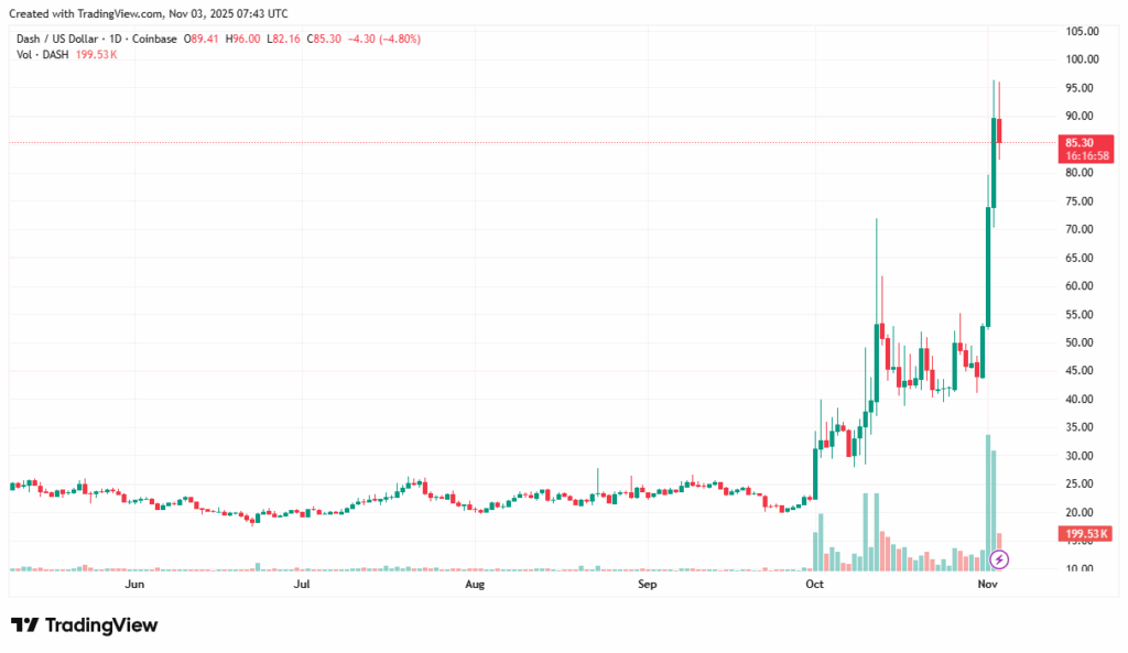Dash (DASH) dominated the charts this week with a 95.83% price rise, reaching $90.20 alongside a massive $1.01B trading volume. The rally places Dash among the best-performing altcoins of early November, with Zcash and Virtuals Protocol following at 44.77% and 36.67% gains respectively.