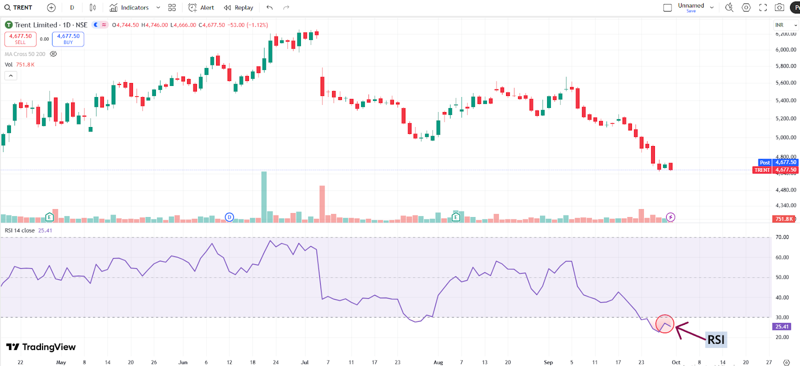 With a market capitalization of Rs. 1,66,318.36 crores on Tuesday, the stock closed at Rs. 4678.60, with an RSI of 25.41, indicating that it is in the oversold zone, offering the potential for an upside bounce.