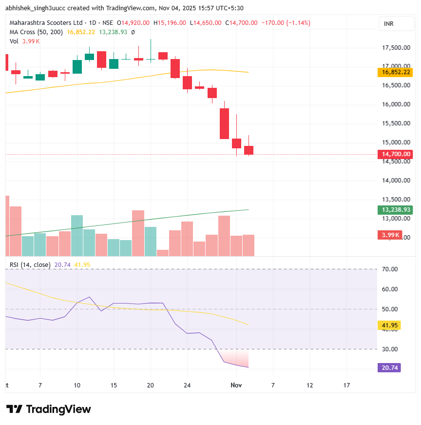 With a market capitalization of Rs. 16,800 crores on Tuesday, the stock closed at Rs. 14,700 apiece, with an RSI of 20.74, indicating that it is in the oversold zone, offering the potential for an upside bounce.