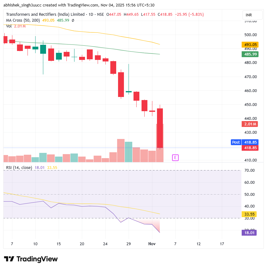 With a market capitalization of Rs. 12,578 crores on Tuesday, the stock closed at Rs. 419 apiece, with an RSI of 18.01, indicating that it is in the oversold zone, offering the potential for an upside bounce.