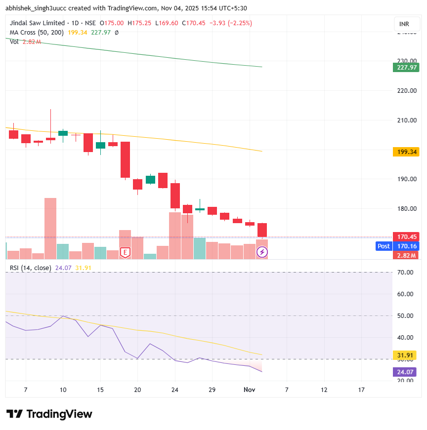 With a market capitalization of Rs. 10,929 crores on Tuesday, the stock closed at Rs. 171 apiece, with an RSI of 24.07, indicating that it is in the oversold zone, offering the potential for an upside bounce.