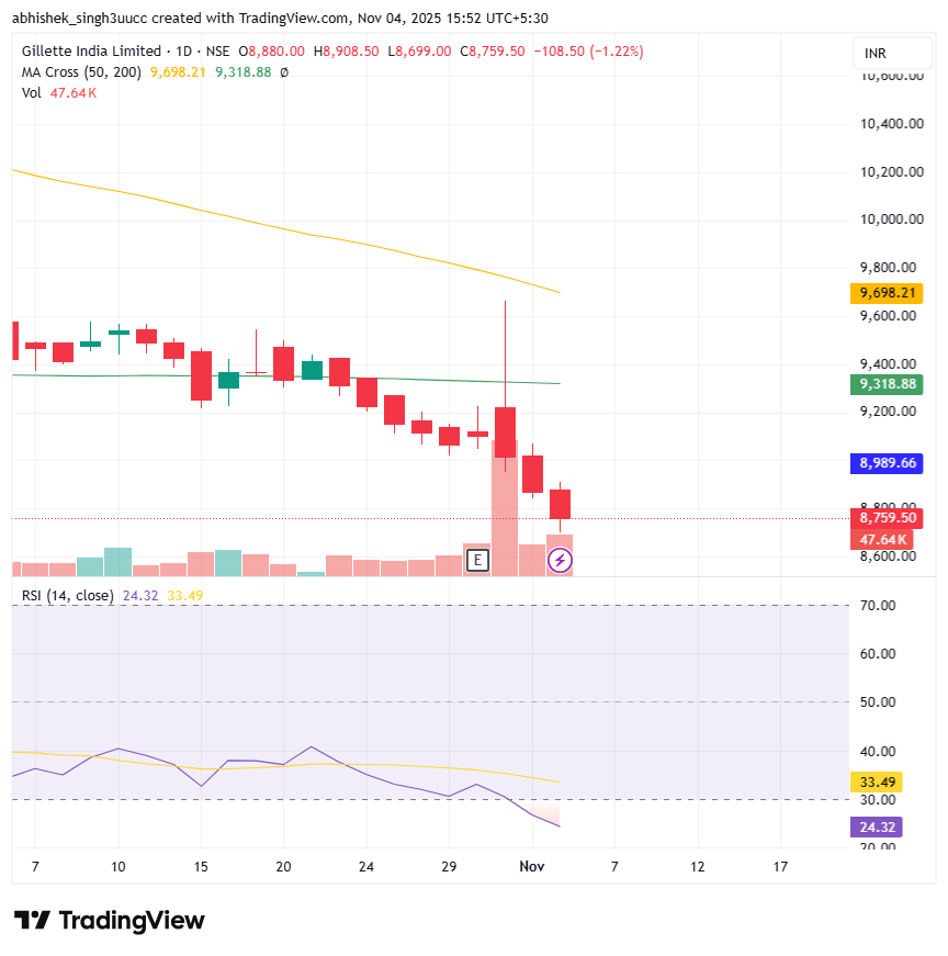 With a market capitalization of Rs. 28,467 crores on Tuesday, the stock closed at Rs. 8,735 apiece, with an RSI of 24.32, indicating that it is in the oversold zone, offering the potential for an upside bounce.