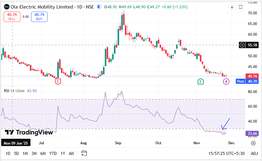With market capitalization of Rs. 17,952.08 cr, the shares of Ola Electric Mobility Limited are closed at Rs. 40.70, up by 0.27 percent from its previous close of Rs. 40.59 per equity share.