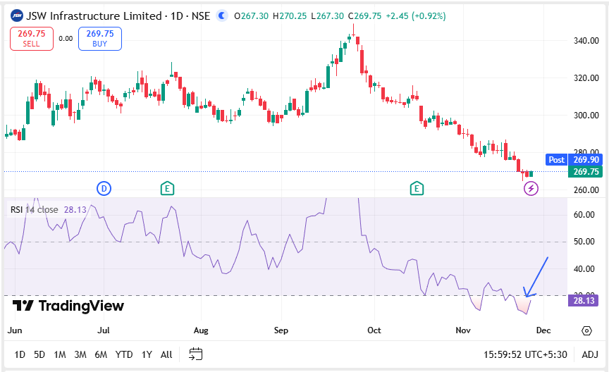 With market capitalization of Rs. 56,679.04 cr, the shares of JSW Infrastructure Limited are closed at Rs. 269.90, up by 0.97 percent from its previous close of Rs. 267.30 per equity share.