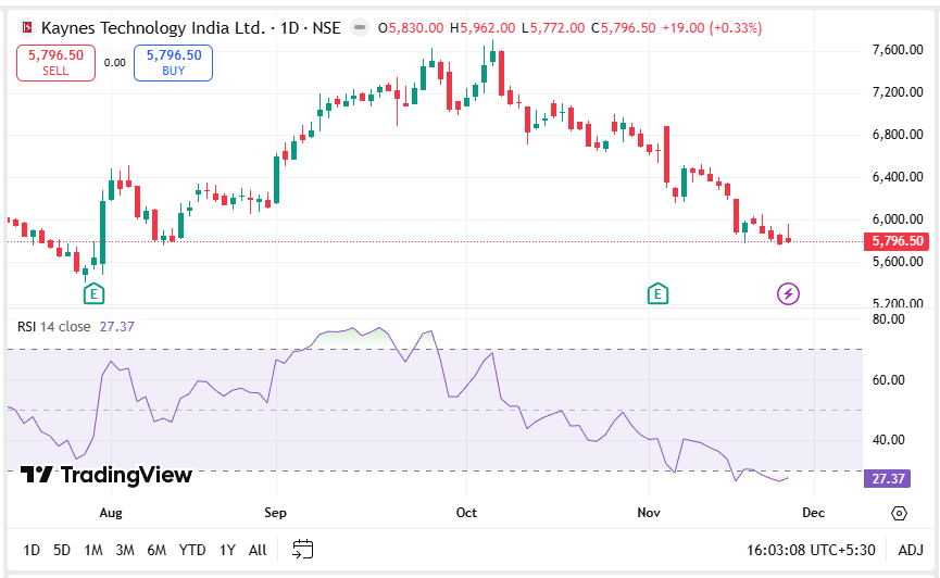 With market capitalization of Rs. 38,866.69 cr, the shares of Kaynes Technology India Limited are closed at Rs. 5,798, up by 0.35 percent from its previous close of Rs. 5,777.50 per equity share.