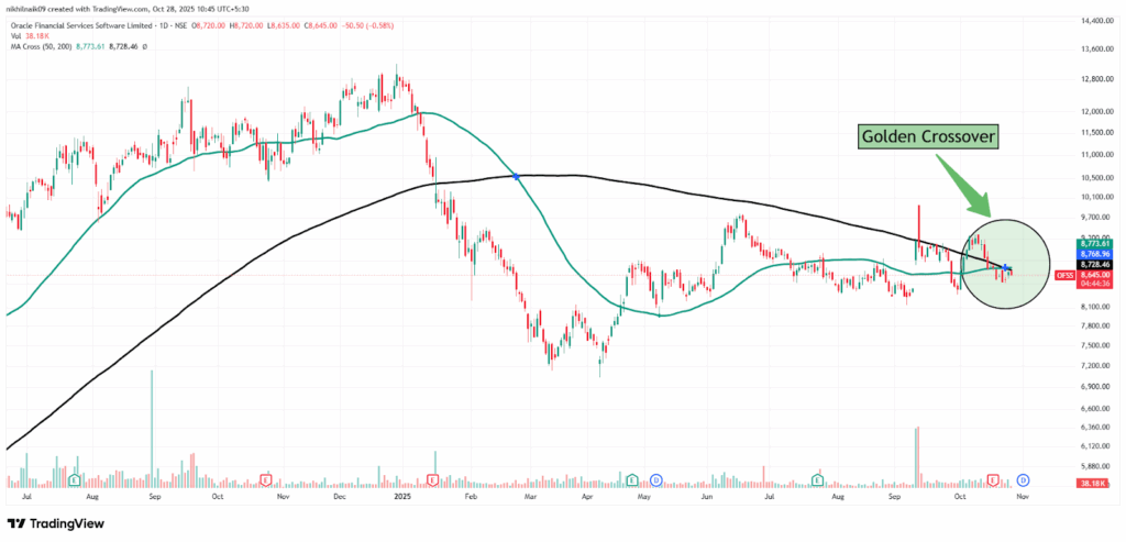 The golden crossover took place on October 24, 2025, at a price of Rs. 8,768.96 with decent volumes of 108.45 K shares. The stock closed at Rs. 8,601.50 in Tuesday’s session, reflecting a 1.08 percent decrease in the intraday trade.