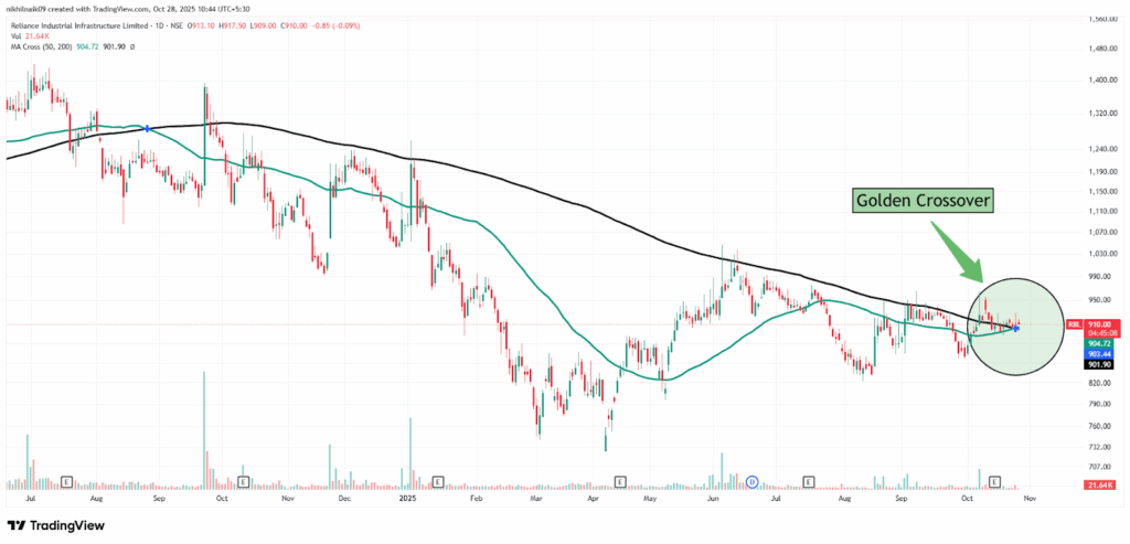 The golden crossover took place on October 27, 2025, at a price of Rs. 903.41 with decent volumes of K shares. The stock closed at Rs. 912.60 in Tuesday’s session, reflecting a 0.19 percent increase in the intraday trade.
