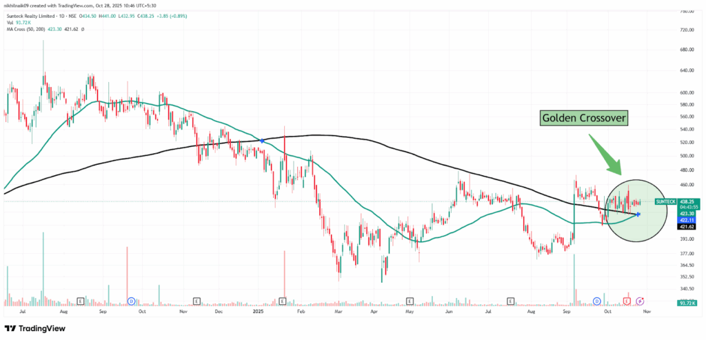 The golden crossover took place on October 27, 2025, at a price of Rs. 422.11 with decent volumes of 185.57 K shares. The stock closed at Rs. 439.75 in Tuesday’s session, reflecting a 1.23 percent increase in the intraday trade.