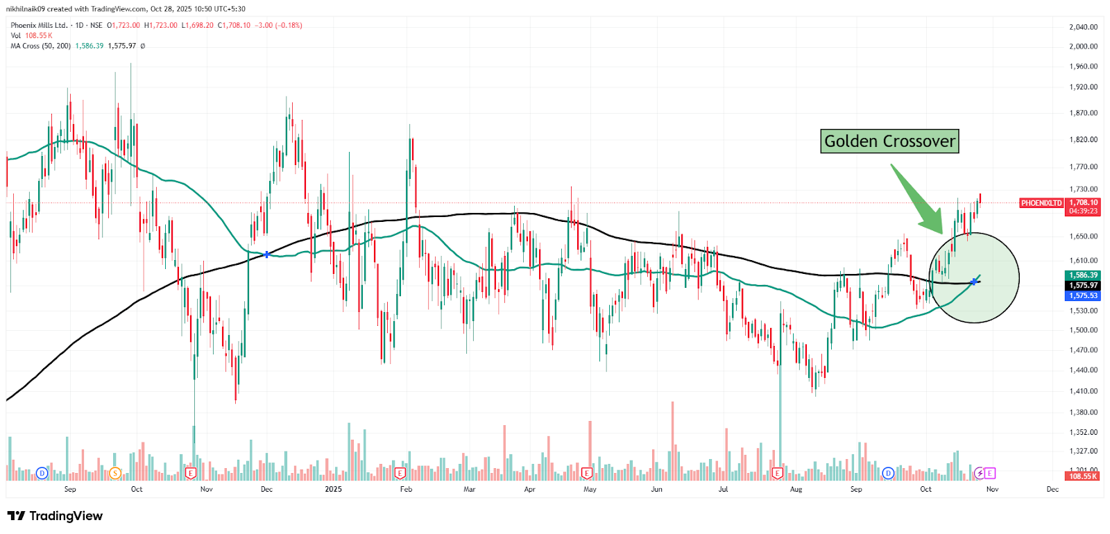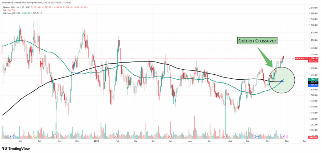 The golden crossover took place on October 24, 2025, at a price of Rs. 1,575.53 with decent volumes of 420.19 K shares. The stock closed at Rs. 1,702 in Tuesday’s session, reflecting a 0.53 percent decrease in the intraday trade.