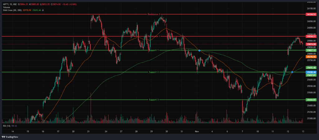 The Nifty 50 Index opened on a positive note at 25,834.30 on Wednesday, up by 139.8 points from Tuesday’s closing of 25,694.5. The index opened on a bullish note on Wednesday and reached the day’s high at 25,934.5, hovering below the key level of 26,000. The index continued its upward trend in the morning session and was trading within the range of 25,800 and 25,900; however, in the afternoon session, it declined from its day’s high and traded within the range of 25,850 and 25,900.