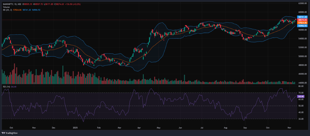 Bollinger Bands (Daily): The index is trading in the upper band of the Bollinger Band range (Simple Moving Average). Its position in the upper range suggests a bullish sentiment, and starting the session on a gap-up on Wednesday, the Index ended on a bullish note. The index took support near 25,781, and 25,935 acted as a resistance level. A sustained move above the middle band signals a bullish sentiment, while a drop back toward the lower band may reinforce bearish sentiment.
