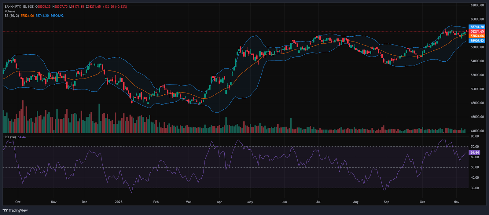 The Bank Nifty index had peaked at 58,507.70 and made a day’s low at 58,171.85. Finally, it had closed in green at 58,274.65, rising above the 58,250 level, gaining 136.50 points or 0.23%. The Relative Strength Index (RSI) stood at 64.4, below the overbought zone of 70 in the daily time frame.