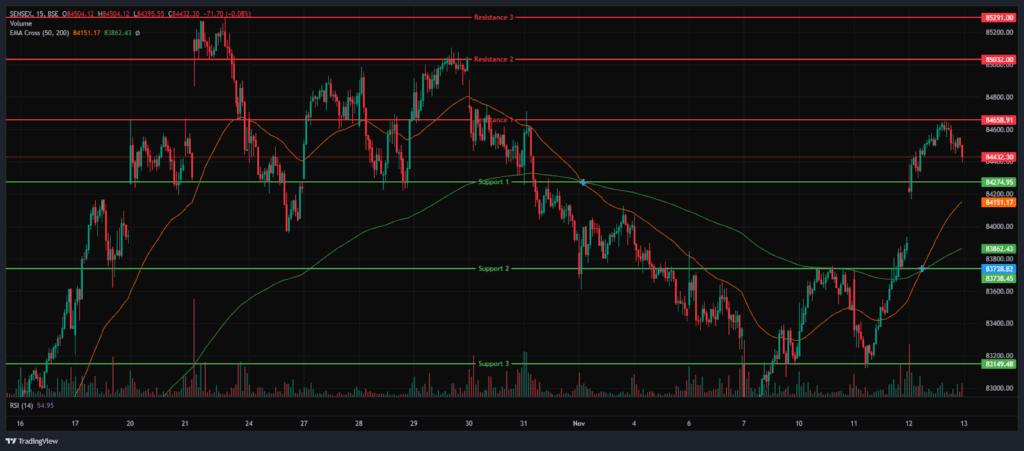 The BSE Sensex Index opened on a positive note at 84,238.86 on Wednesday, up by 367.54 points from Tuesday’s closing of 83,871.32. The Sensex index also opened on a bullish note, mirroring Nifty 50 on Wednesday, and continued its uptrend in the morning session, peaking at 84,652.01. It traded between the range of 84,250 and 84,600 during the morning session. However, in the afternoon session, the index fell from its day’s high and traded between the range of 84,400 and 84,600.