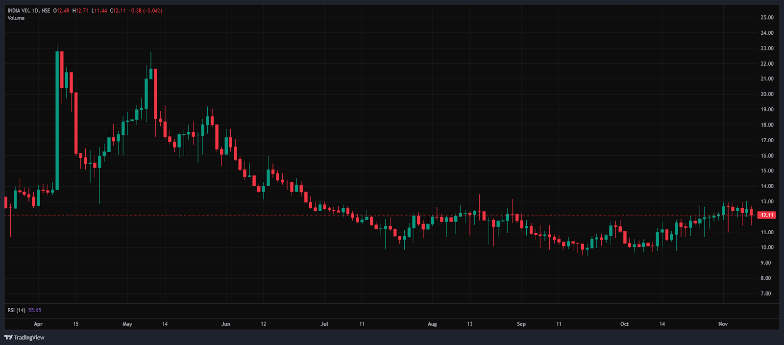 The India VIX decreased 0.38 points or 3.04%, from 12.49 to 12.11 during Wednesday’s session. A decrease in the India VIX typically indicates lower price volatility in the stock market, suggesting a stable market environment. However, a stable market environment and minimal volatility are anticipated when the India VIX is below 15.