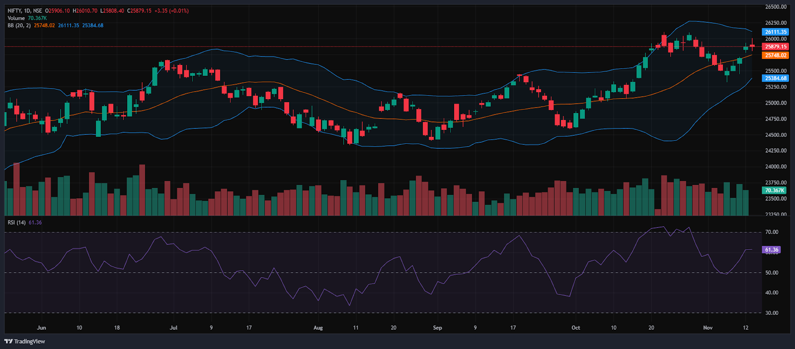 Bollinger Bands (Daily): The index is trading in the upper band of the Bollinger Band range (Simple Moving Average). Its position in the upper range suggests a bullish sentiment, but in Thursday’s session, the Index ended on a flat-bullish note. The index took support near 25,808, and 26,011 acted as a resistance level. A sustained move above the middle band signals a bullish sentiment, while a drop back toward the lower band may reinforce bearish sentiment.