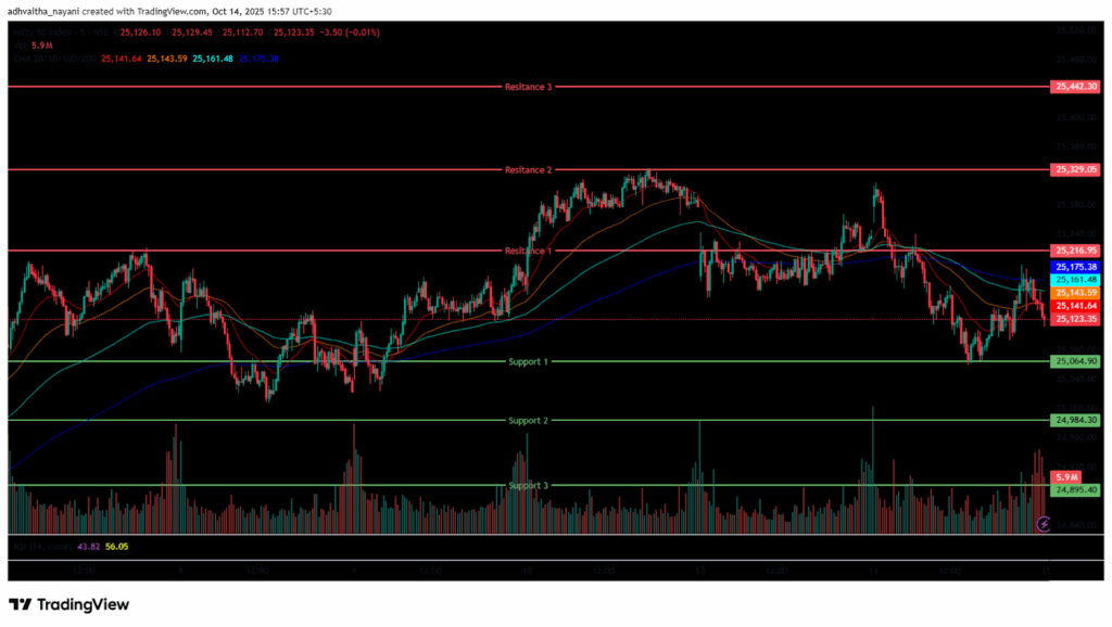 Further, the index recovered from the day’s low and surged as high as the 25,197 mark in the afternoon session and was traded in the range of 25,050 and 25,200. During the afternoon session, the Nifty 50 closed below the EMAs of 20/50/100 but above the 200 EMA in the 15-minute time frame. Nifty’s immediate resistance levels are R1 (25,217), R2 (25,329), and R3 (25,442), while immediate support levels are S1 (25,065), S2 (24,984), and S3 (24,895).