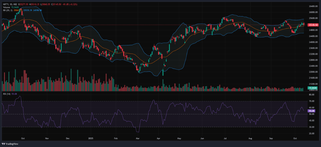 Bollinger Bands (Daily): The index is trading in the upper band of the Bollinger Band range above the middle band (Simple Moving Average). Its position in the upper range indicates a bullish sentiment and the Index took support of the Middle Band at 25,067 and pulled back to the 25,145 level. A sustained move above the middle band signals a bullish sentiment, while a drop back toward the lower band may reinforce bearish sentiment.