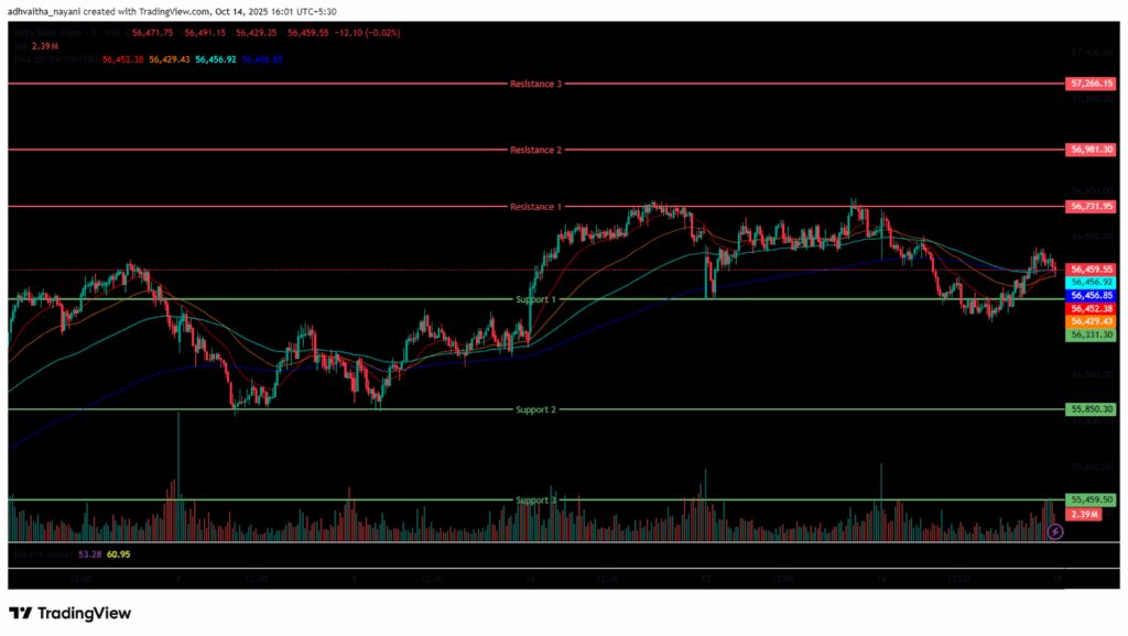 Further, the Index was trading in the range of 56,200 and 56,600, and ended in red below its opening level. During the afternoon session, Bank Nifty closed above all four EMAs of 20/50/100/200 in the 15-minute time frame. Bank Nifty immediate resistance levels are R1 (56,732), R2 (56,981), and R3 (57,266), while immediate support levels are S1 (56,331), S2 (55,850), and S3 (55,459).
