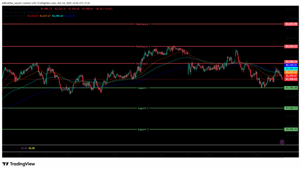 In the afternoon session, the Index recovered from the day’s low and was traded around 81,800 and 82,250, maintaining its overall bearish trend and closing below the EMAs of 20/50/100 but above the 200 EMA in the 15-minute time frame. BSE Sensex immediate resistance levels are R1 (82,284), R2 (82,635), and R3 (83,094), while immediate support levels are S1 (81,780), S2 (81,367), and S3 (80,929).