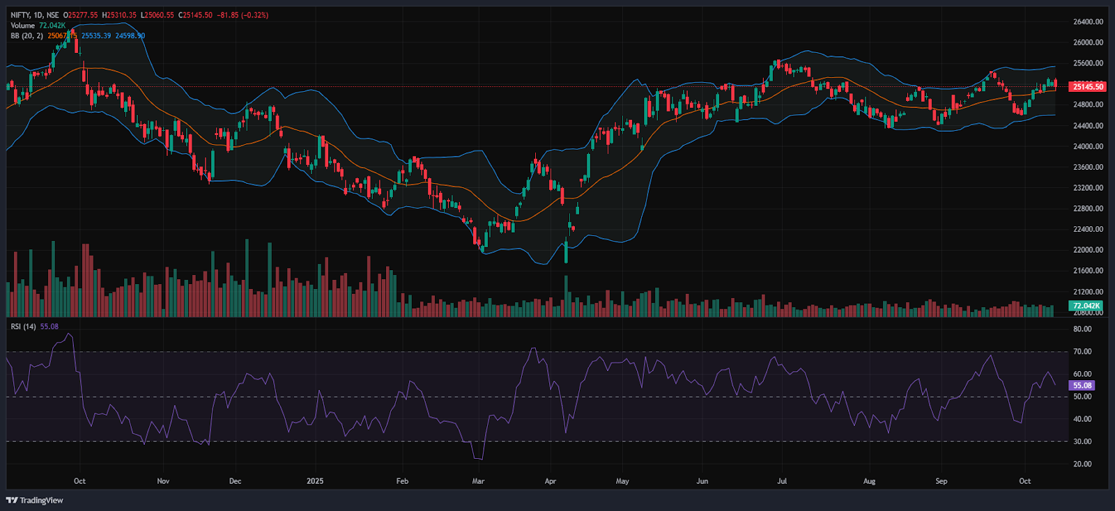 Bollinger Bands (Daily): The index is trading in the upper band of the Bollinger Band range above the middle band (Simple Moving Average). Its position in the upper range indicates a bullish sentiment and the Index took support of the Middle Band at 25,067 and pulled back to the 25,145 level. A sustained move above the middle band signals a bullish sentiment, while a drop back toward the lower band may reinforce bearish sentiment.