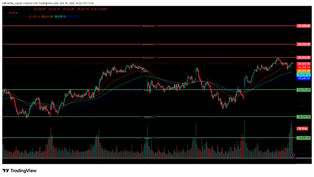 Further, the index continued its momentum and surged as high as 25,365, marking its day’s high in the afternoon session and was traded in the range of 25,250 and 25,350. During the afternoon session, the Nifty 50 closed above all four EMAs of 20/50/100/200 in the 15-minute time frame. The Nifty’s immediate resistance levels are R1 (25,364), R2 (25,442), and R3 (25,549), while immediate support levels are S1 (25,176), S2 (25,019), and S3 (24,895).