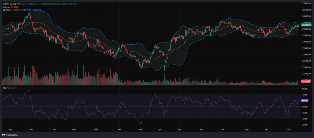 Bollinger Bands (Daily): The index is trading in the upper band of the Bollinger Band range above the middle band (Simple Moving Average). Its position in the upper range indicates a bullish sentiment, and the Index took support at 25,150 and pulled back to the 25,300 level. A sustained move above the middle band signals a bullish sentiment, while a drop back toward the lower band may reinforce bearish sentiment.