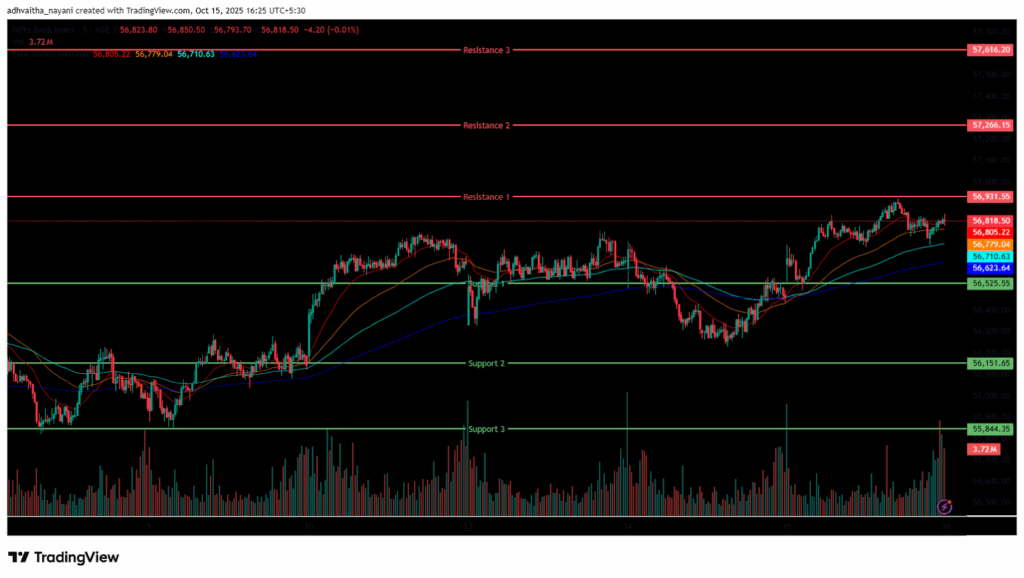 Further, the Index was trading in the range of 56,700 and 56,950, and ended in green above its opening level. During the afternoon session, Bank Nifty closed above all four EMAs of 20/50/100/200 in the 15-minute time frame. The Bank Nifty’s immediate resistance levels are R1 (56,932), R2 (57,266), and R3 (57,616), while its immediate support levels are S1 (56,526), S2 (56,152), and S3 (55,844).