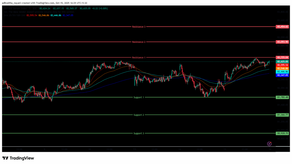 In the afternoon session, the Index continued to rise and was trading around 82,550 and 82,650, maintaining its overall bullish trend and closing above the EMAs of 20/50/100/200 in the 15-minute time frame. The BSE Sensex immediate resistance levels are R1 (82,725), R2 (83,094), and R3 (83,455), while immediate support levels are S1 (81,780), S2 (81,367), and S3 (80,929).