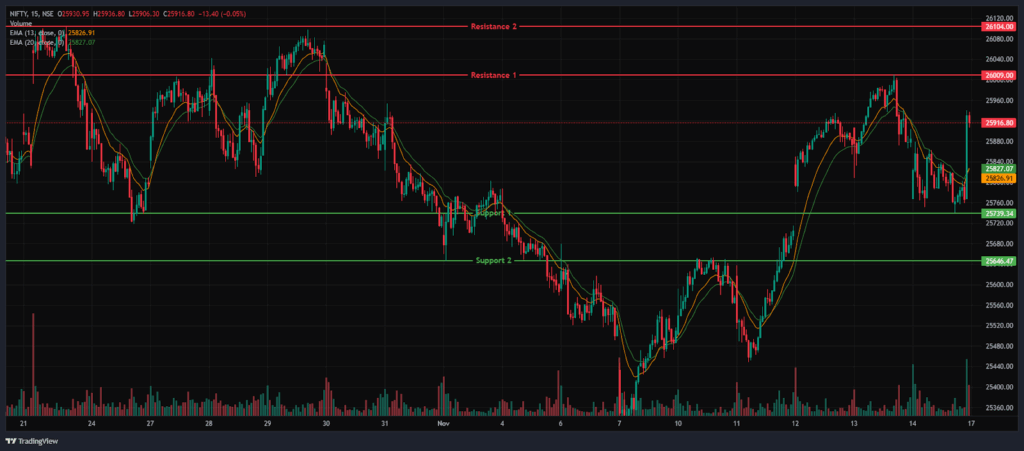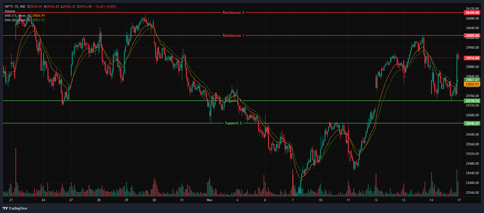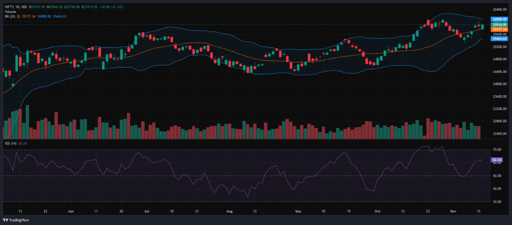 Bollinger Bands (Daily): The index is trading in the upper band of the Bollinger Band range (Simple Moving Average). Its position in the upper range suggests a bullish sentiment and in Friday’s session, the Index formed a large bullish candle with minimal wicks on both ends and ended on a bullish note. The index took support near 25,741, and 25,940 acted as a resistance level. A sustained move above the middle band signals a bullish sentiment, while a drop back toward the lower band may reinforce bearish sentiment.