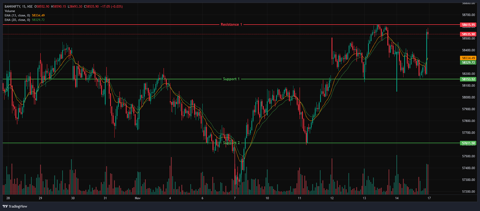The Bank Nifty Index opened on a negative note at 58,050.00 on Friday, down by 331.95 points from Thursday’s closing of 58,381.95. The index opened on a negative note and dragged down to the 58,050 level, marking its day low in the morning session, but later recovered from the day’s low and was trading between the 58,000 and 58,500 levels. In the afternoon session, the index rallied from low to peak at the 58,590 level, marking its day high and traded between the range of 58,150 and 58,600.